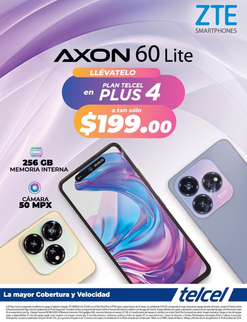 Este smartphone no solo destaca por su diseño moderno y sus especificacionesavanzadas, sino también por su rendimiento excepcional. Con un procesador Octa-core1.6 GHz, almacenamiento de 256 GB internos y una batería 5,000 mAh de largaduración con carga rápida de 22.5 W, el Axon 60 Lite está diseñado para acompañar alos usuarios en su día a día, ya sea en el trabajo, el estudio o el entretenimiento. Lostérminos para adquirir el Axon 60 Lite en el Plan Telcel Plus 4, pueden consultarseenCentros de Atención a Clientes o con la red de Distribuidores Autorizados Telcel.